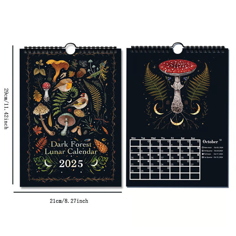 ✧Dark Forest Lunar Calendar 2025: Features 12 original illustrations that I have drawn throughout the year. Botanical motives, magical creatures and plants, forest, nature, wild life, the moon and stars and the power within us. The grid with all the information and icons was handmade.
